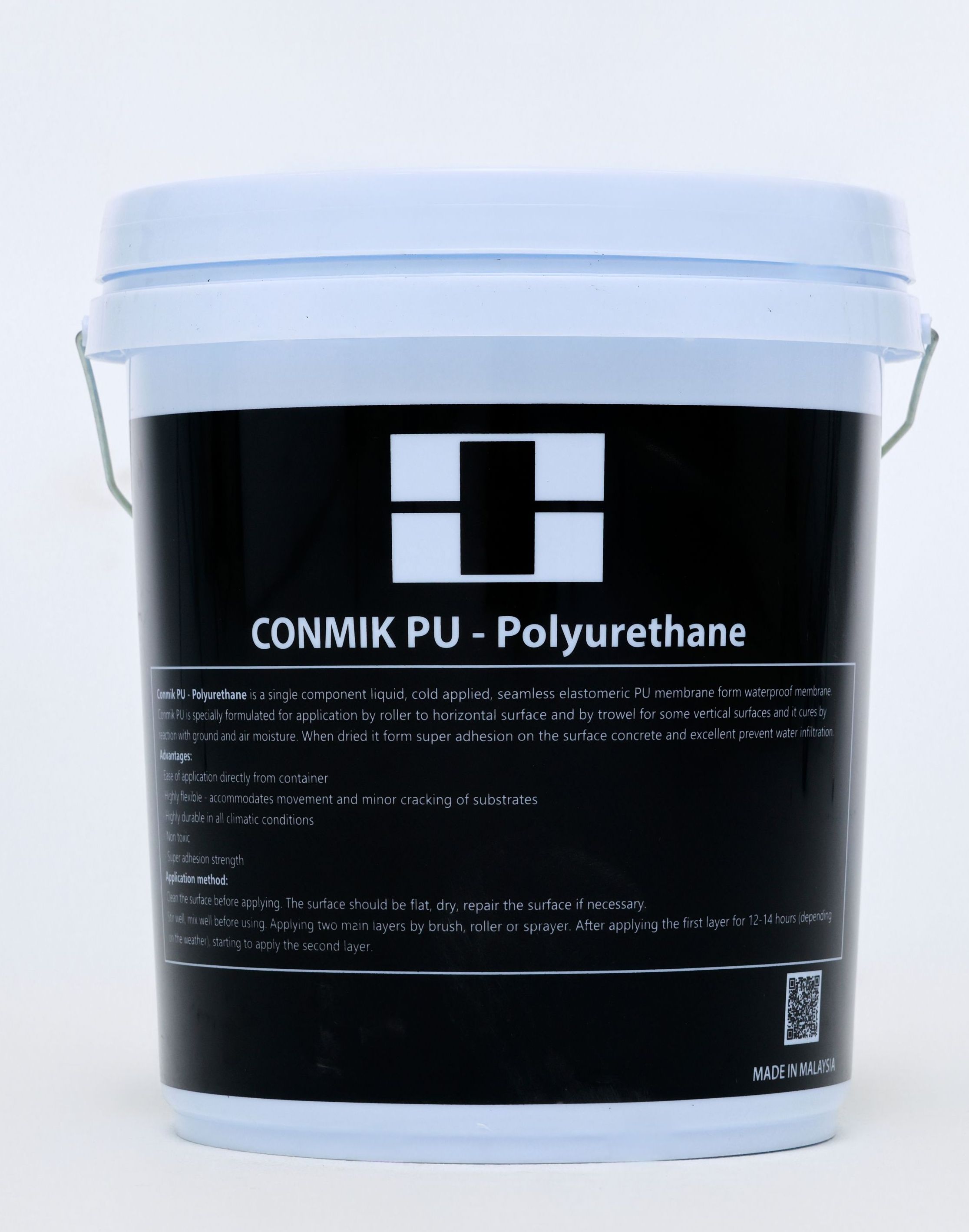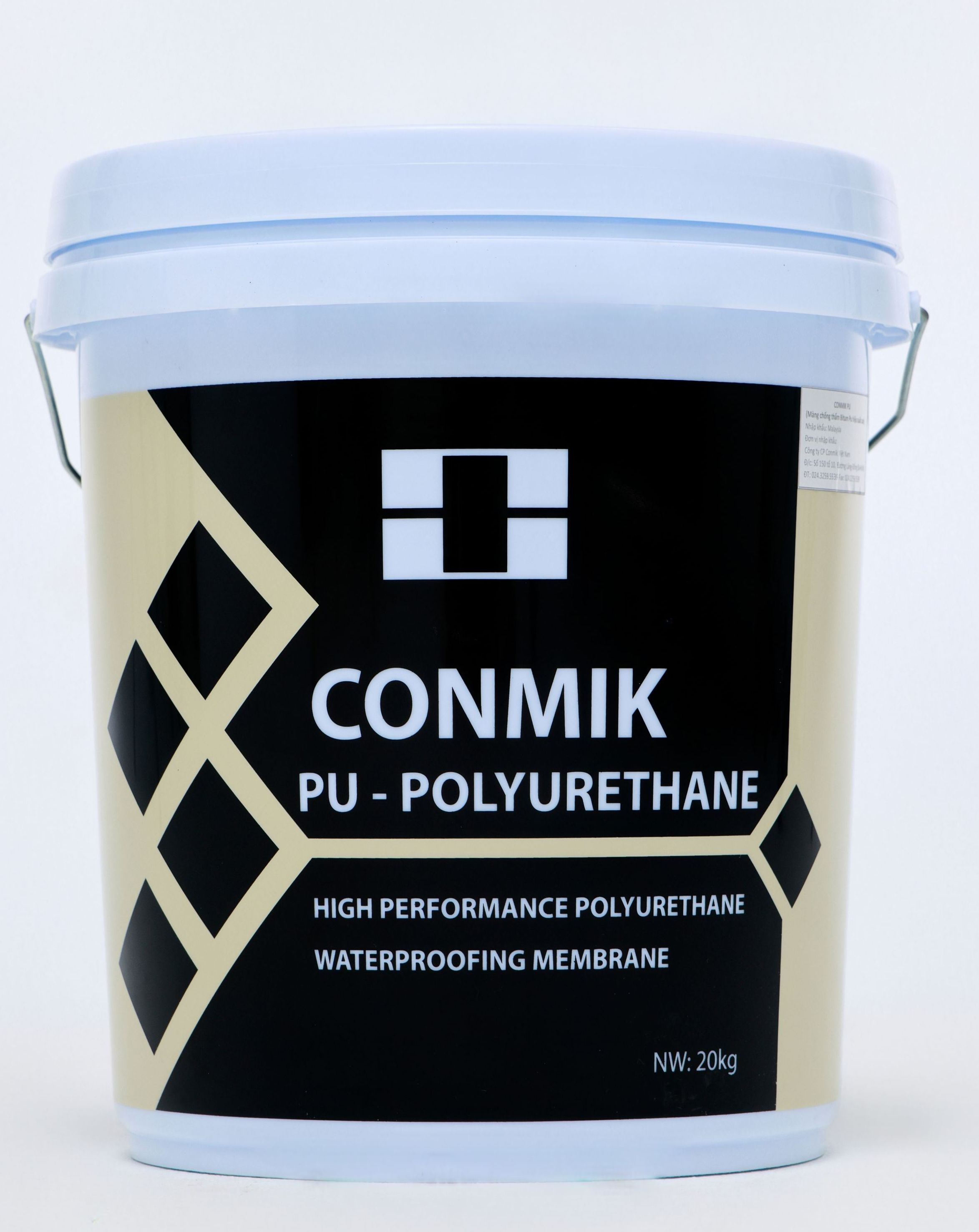 Conmik PU là màng chống thấm gốc Polyurethane (PU) đàn hồi liền mạch không mối nối thi công lạnh dạng lỏng 1 thành phần. Conmik PU được thiết kế để thi công bằng con lăn, chổi hoặc máy phun lên bề mặt ngang và bề mặt thẳng đứng, bảo dưỡng nhờ phản ứng tương tác với bề mặt và độ ẩm không khí. Khi khô có độ bám dính rất tốt với bề mặt bê tông, ngăn nước rỉ qua bề mặt.