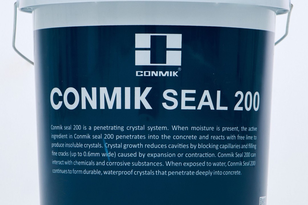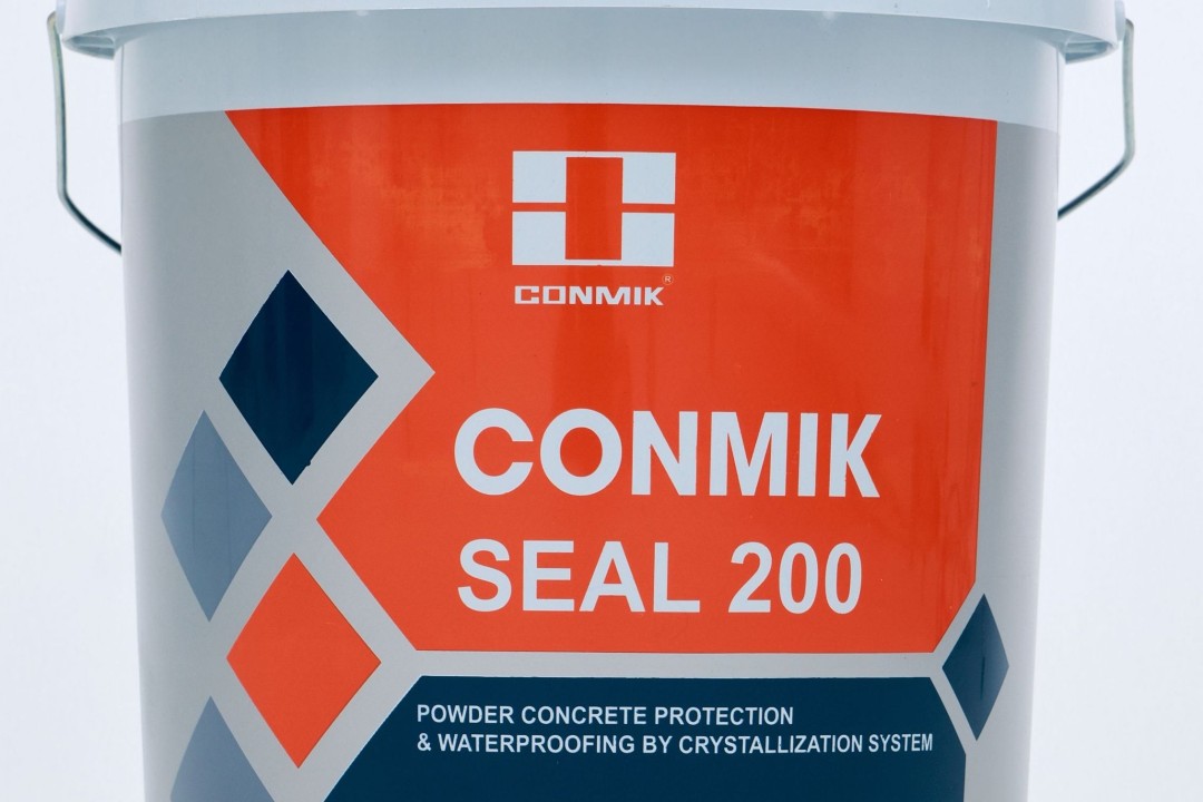 Conmik Seal 200 là hệ thống tinh thể thẩm thấu. Khi xuất hiện hơi ẩm, hoạt chất trong CONMIK SEAL 200 thẩm thấu vào bê tông và phản ứng với vôi tự do để sản xuất tinh thể không hòa tan. Sự phát triển của tinh thể làm giảm tình trạng lỗ rộng bằng cách khóa các mao mạch và trám vào các vết nứt mảnh (rộng đến 0.5mm) gây ra bởi sự giãn nở hoặc co ngót.